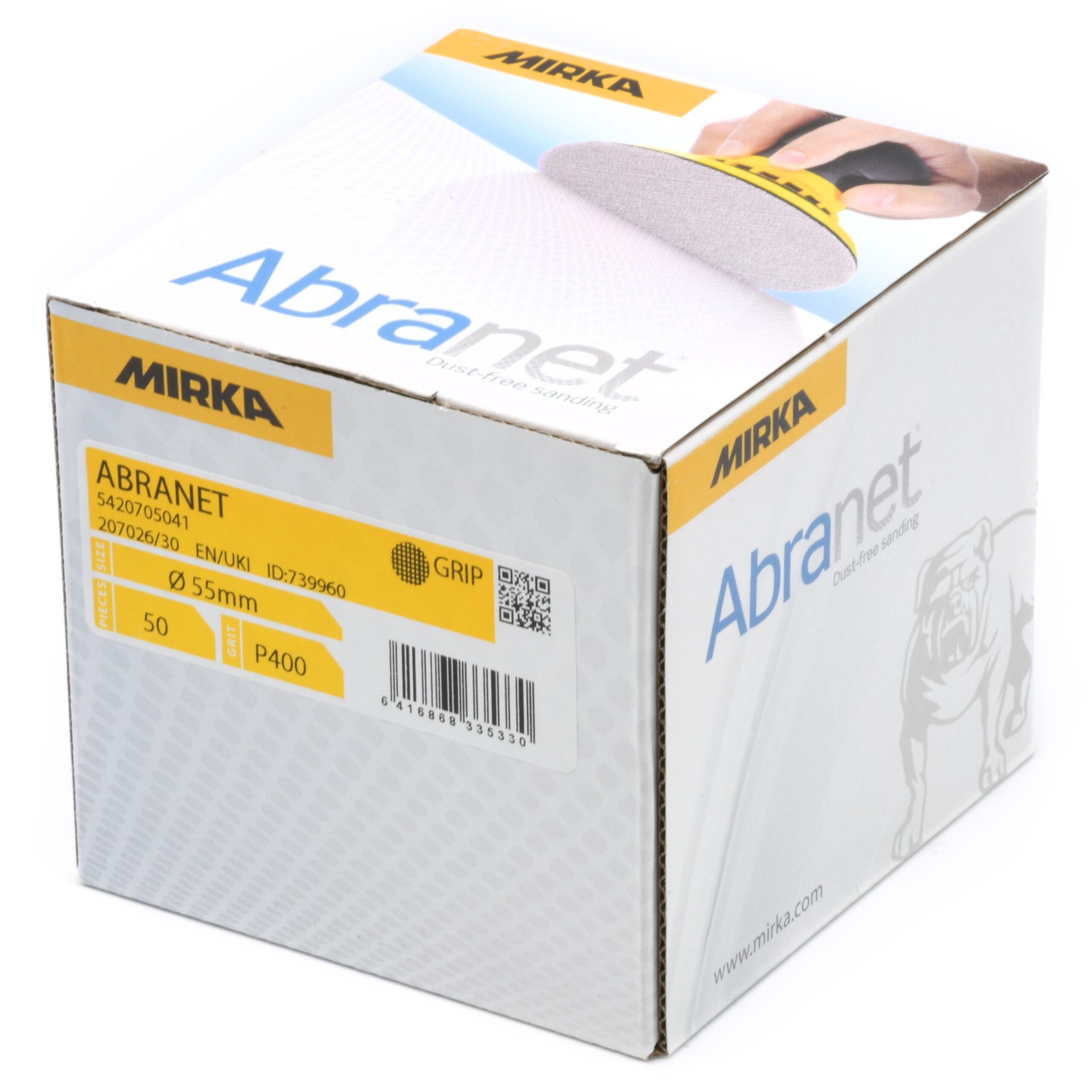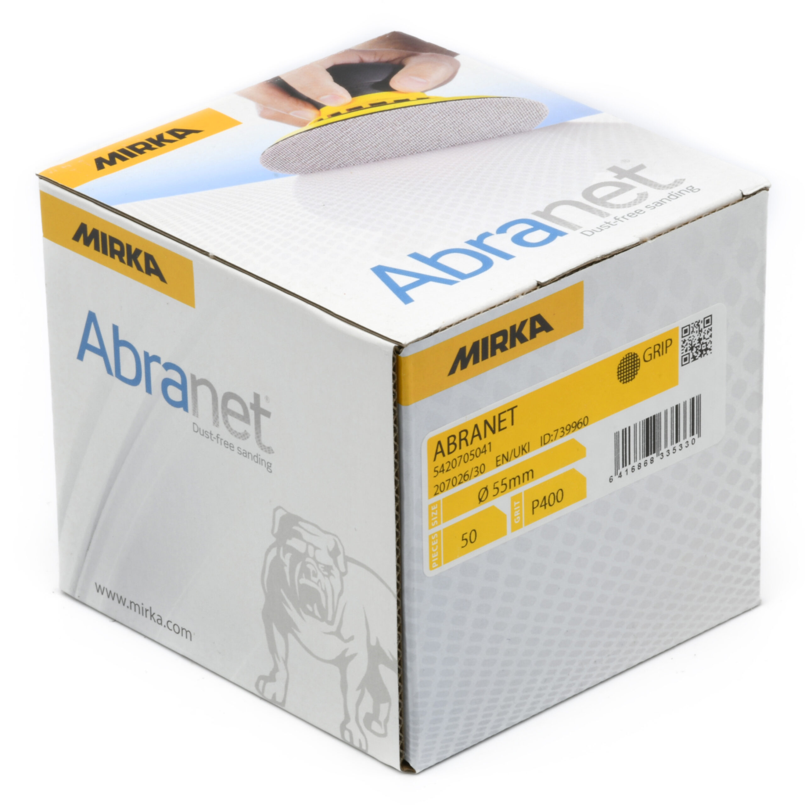 Abranet Discs 55mm. Abranet is a revolutionary new sanding material for dust-free sanding. This unique patented sanding material contains thousands of small holes, making it possible to effectively vacuum dust and other particles away without clogging the disc surface. The result is a very uniform sanding pattern and a perfectly smooth surface. Since the amount of airborne dust has been minimised, the work environment is remarkably improved. Abranet has been developed for sanding filler, primers, lacquers, composite materials and a large number of other materials. This is a durable long-lasting sanding material.