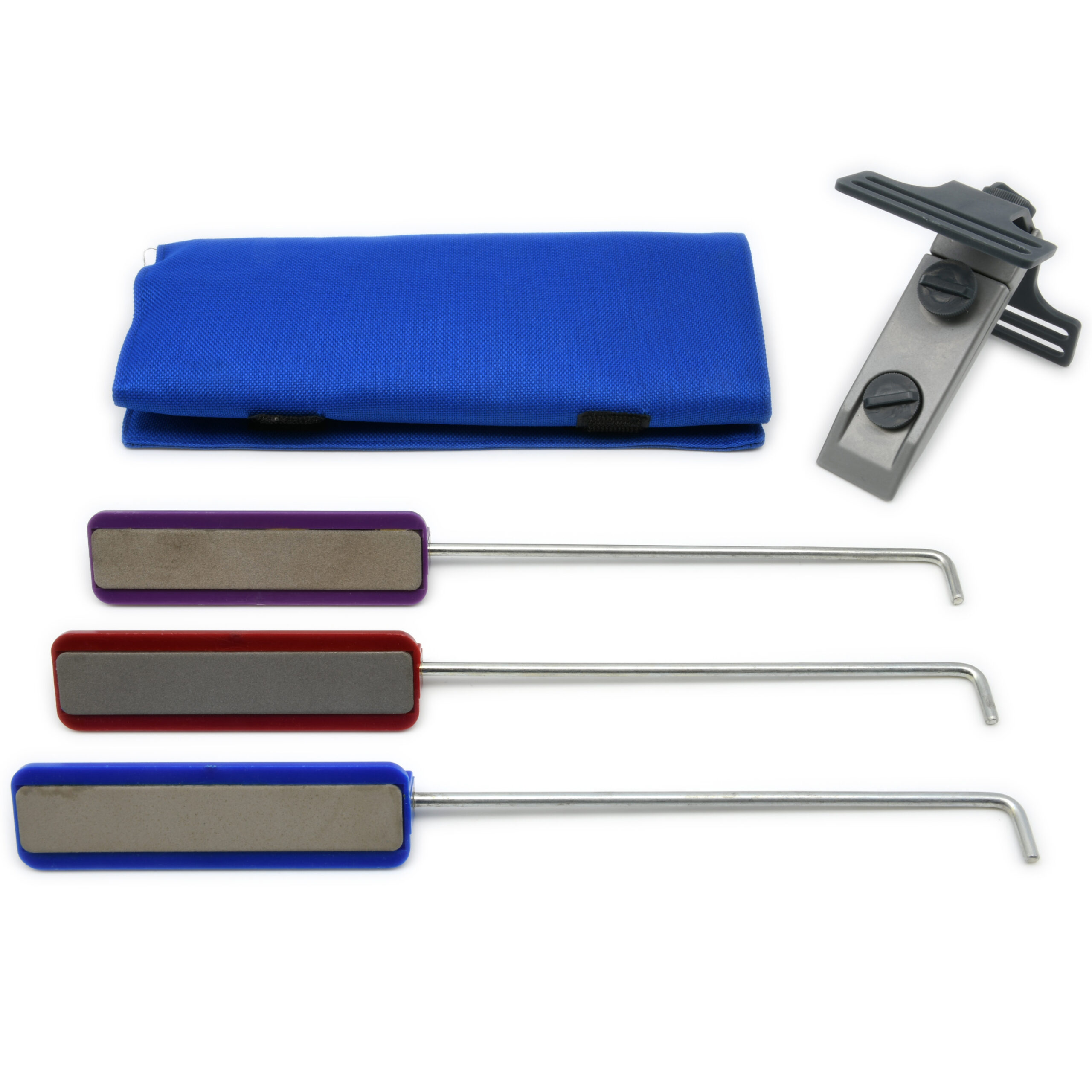 The EZE-LAP Knife Sharpening Kit includes a knife clamp, angle guides, guide rods, a roll pouch and Superfine, Fine and Medium Diamond sharpening stones. Simply clamp the frame to your knife and insert the guide rod on the end of the stone through the angle guide. The stone should be moved in a circular motion on the knife blade for the most even results. Work your way up through the grits, starting with the coarse if your knife is very blunt.