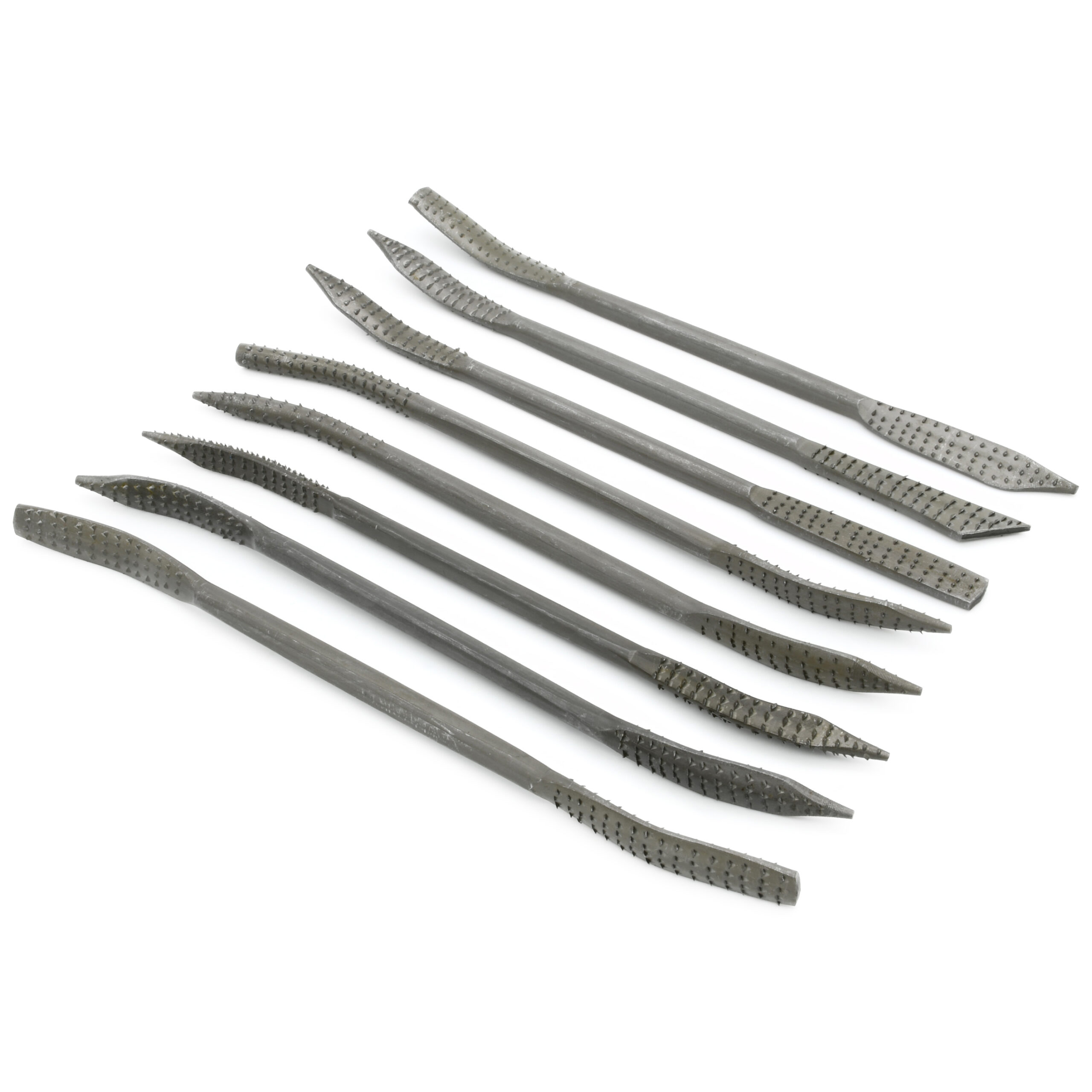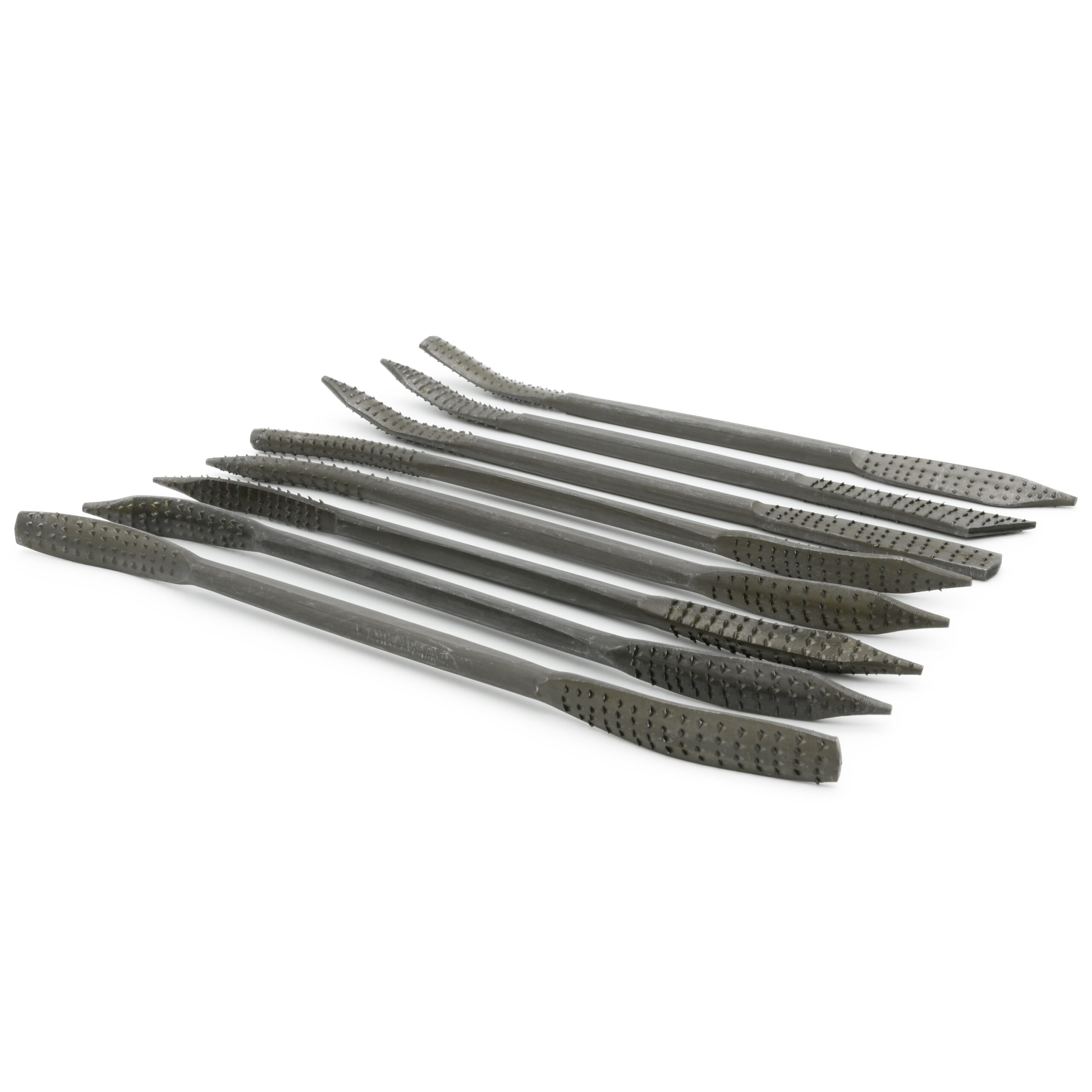 The Double Ended Wood Riffler Set is a premium quality set of hand tools designed for shaping and detailing in woodworking and other crafts. Made from high-quality steel, this set includes 8 double-ended tools, each with a unique shape and size to help you with shaping out less intricate work. The tools are heavy duty and yet compact, making them easy to maneuver and control for shaping work. Each one measures 8″ long and features coarse-cut teeth.